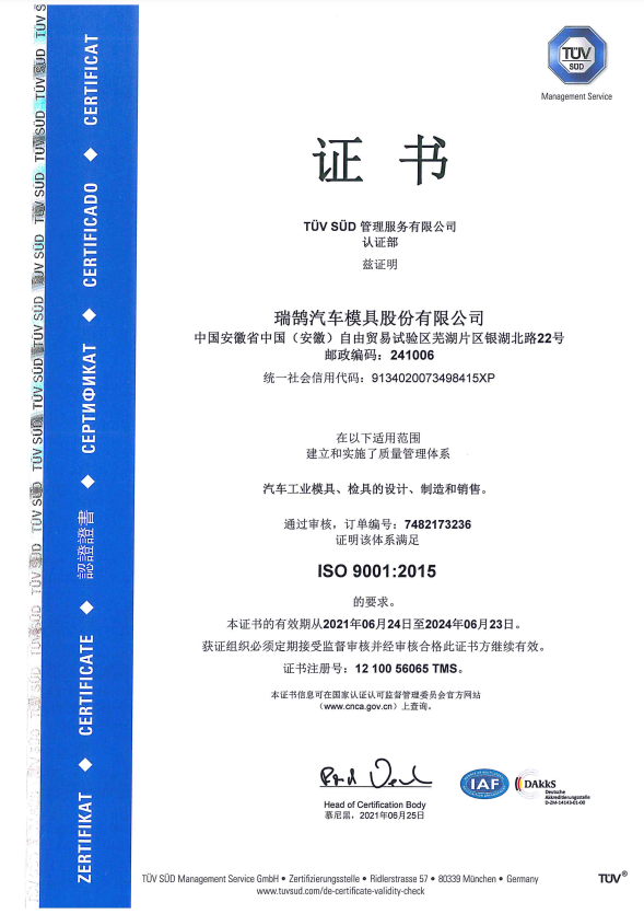 ????????瑞鵠汽車模具股份有限公司成立于2002年3月,坐落于中國(安徽)自由貿(mào)易試驗區(qū)蕪湖片區(qū)銀湖北路 22 號,股本數(shù)18360萬,公司的主營業(yè)務(wù)為汽車沖壓模具、檢具及焊裝自動化生產(chǎn)線的開發(fā)、設(shè)計、制造和銷售,主要產(chǎn)品有沖壓模具(覆蓋件模具、高強板模具)及檢具、焊裝自動化生產(chǎn)線、一體化鋁壓鑄零部件,為國內(nèi)少數(shù)能夠同時為客戶提供完整的汽車白車身高端制造裝備、智能制造技術(shù)及整體解決方案的企業(yè)之一。